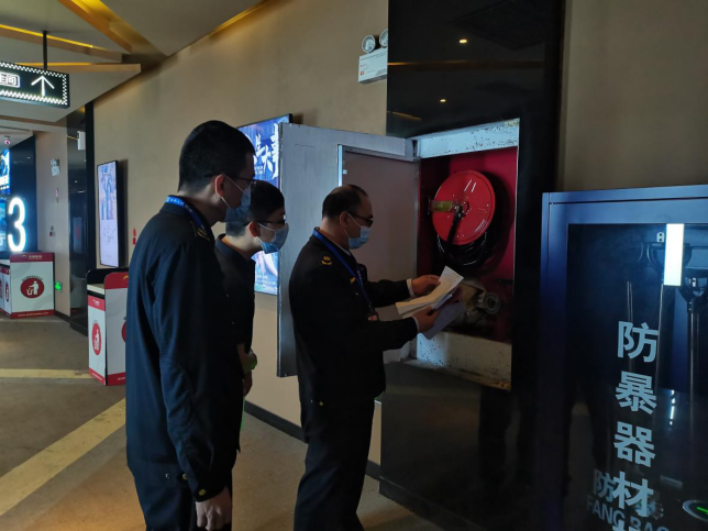 圖為執(zhí)法人員認真檢查轄區(qū)內(nèi)影院消防設(shè)施定期檢測記錄。