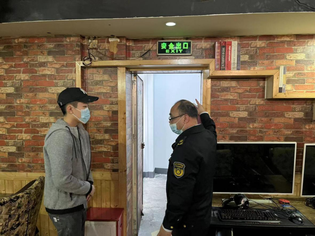 圖為執(zhí)法人員認真檢查轄區(qū)內(nèi)網(wǎng)吧消防逃生通道是否暢通無阻。