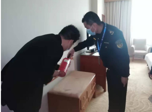 圖為執(zhí)法人員認真檢查轄區(qū)內(nèi)星級酒店客房消防設(shè)備情況。
