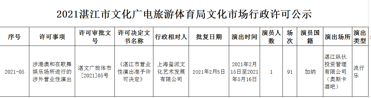2021湛江市文化廣電旅游體育局文化市場行政許可公示(2021.2.6)