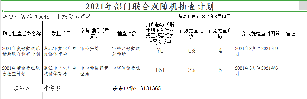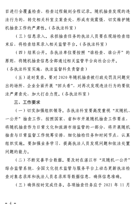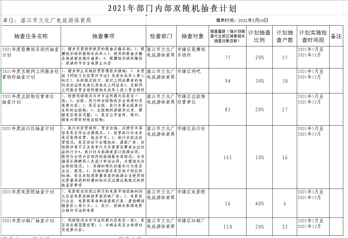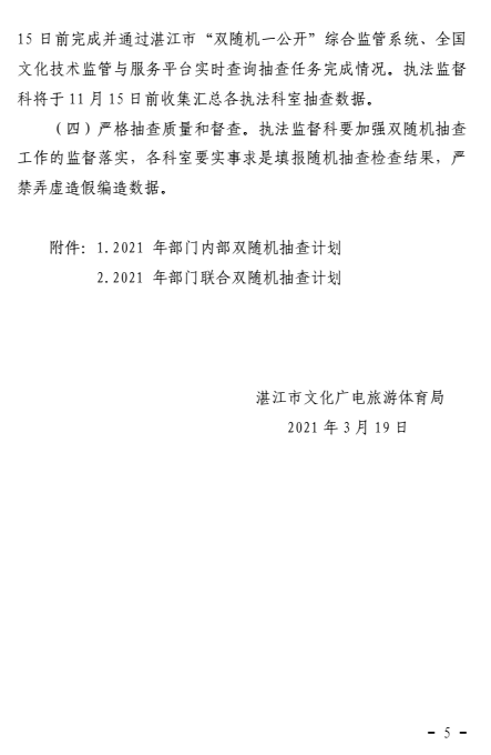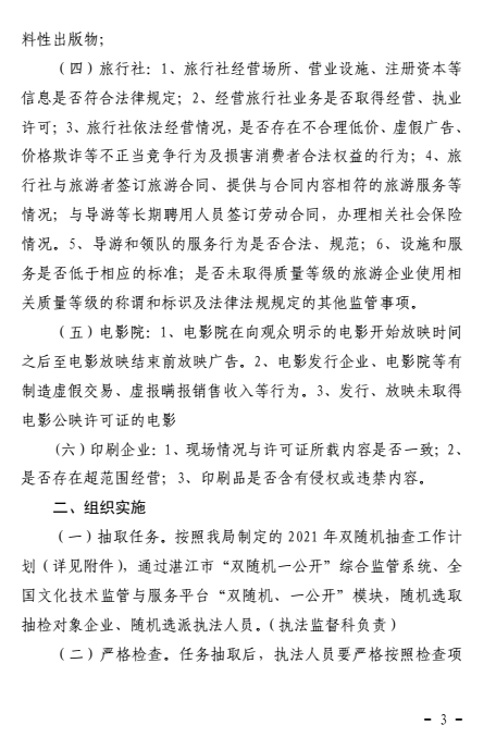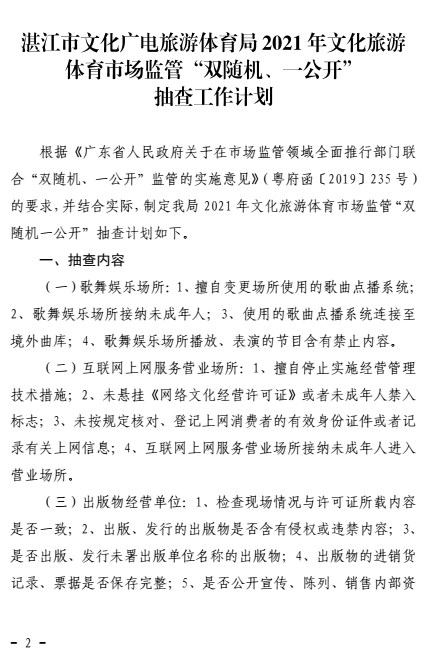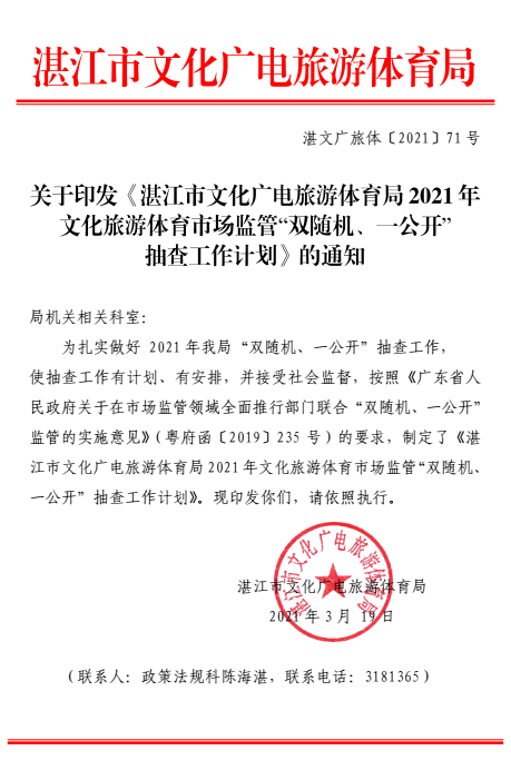 關(guān)于印發(fā)《湛江市文化廣電旅游體育局2021年文化旅游體育市場監(jiān)管“雙隨機、一公開”抽查工作計劃》的通知