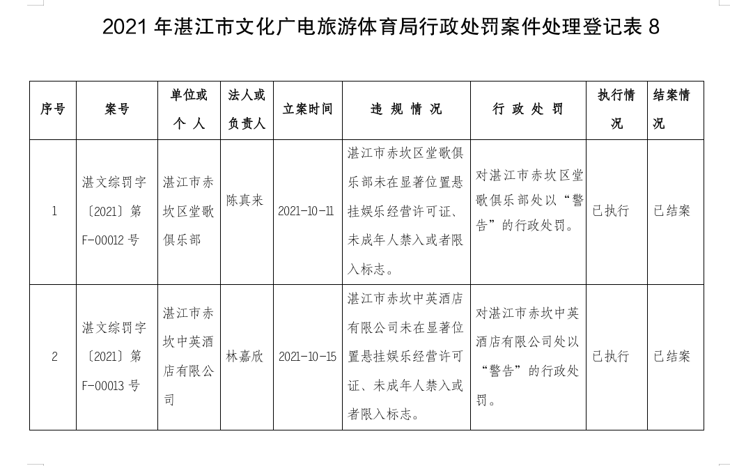 2021年湛江市文化廣電旅游體育局行政處罰案件處理登記表8
