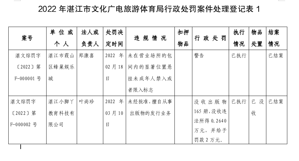 2022年湛江市文化廣電旅游體育局行政處罰案件處理登記表1