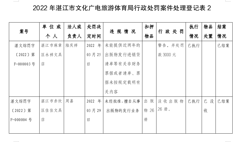 2022年湛江市文化廣電旅游體育局行政處罰案件處理登記表2