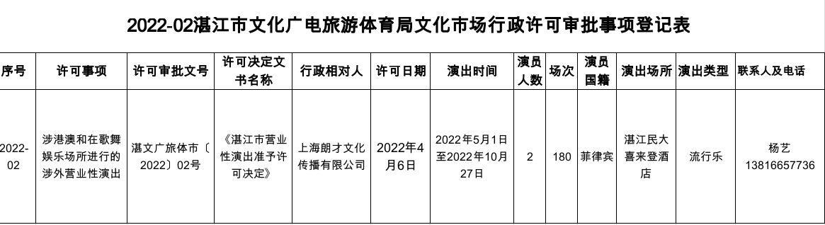2022-02湛江市文化廣電旅游體育局文化市場行政許可審批事項(xiàng)登記表