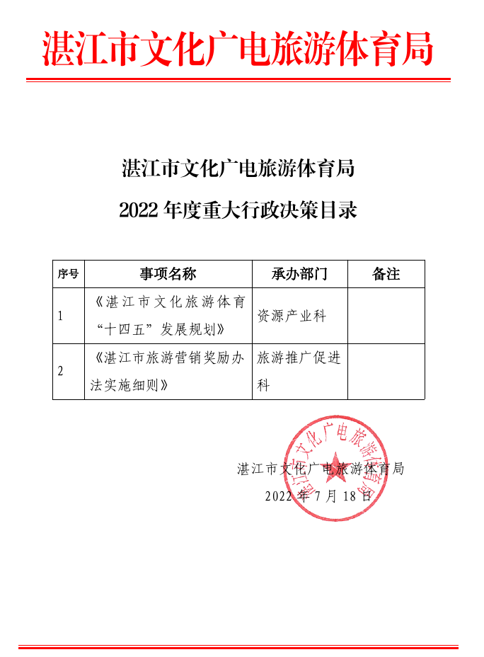 湛江市文化廣電旅游體育局2022年度重大行政決策目錄