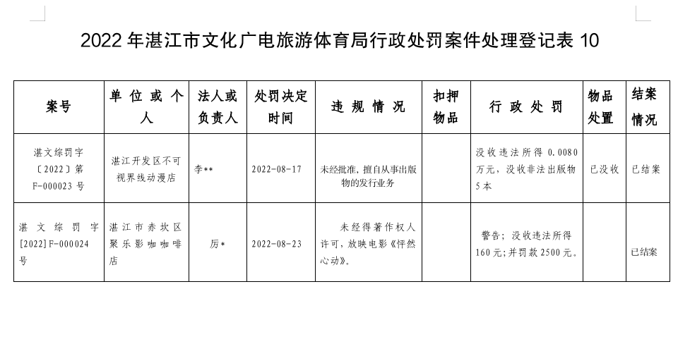 2022年湛江市文化廣電旅游體育局行政處罰案件處理登記表10