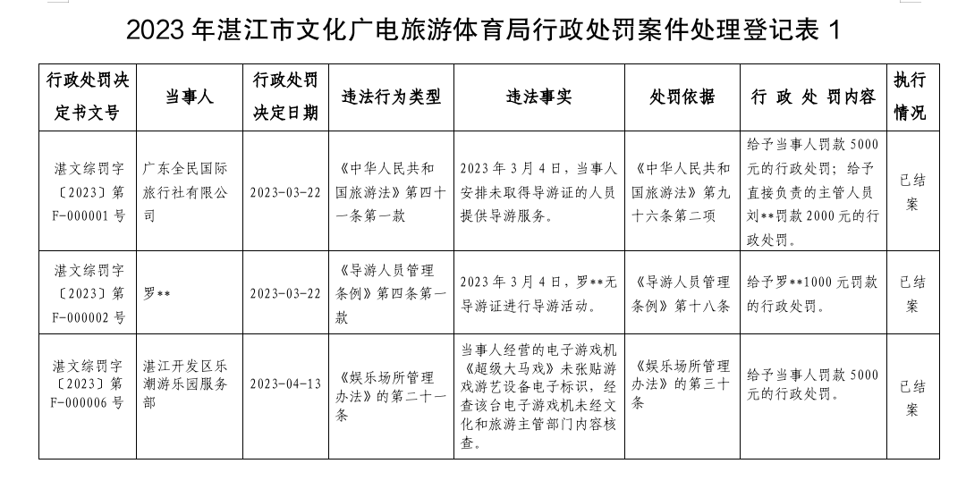 2023年湛江市文化廣電旅游體育局行政處罰案件處理登記表1