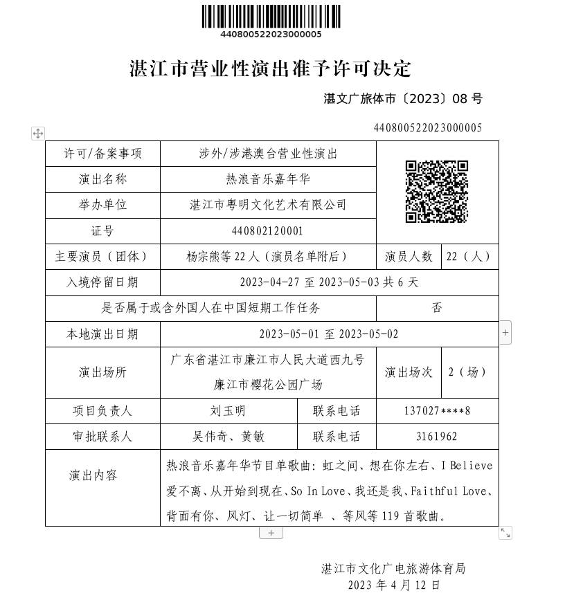 湛江市營(yíng)業(yè)性演出準(zhǔn)予許可決定(湛文廣旅體市〔2023〕08號(hào))