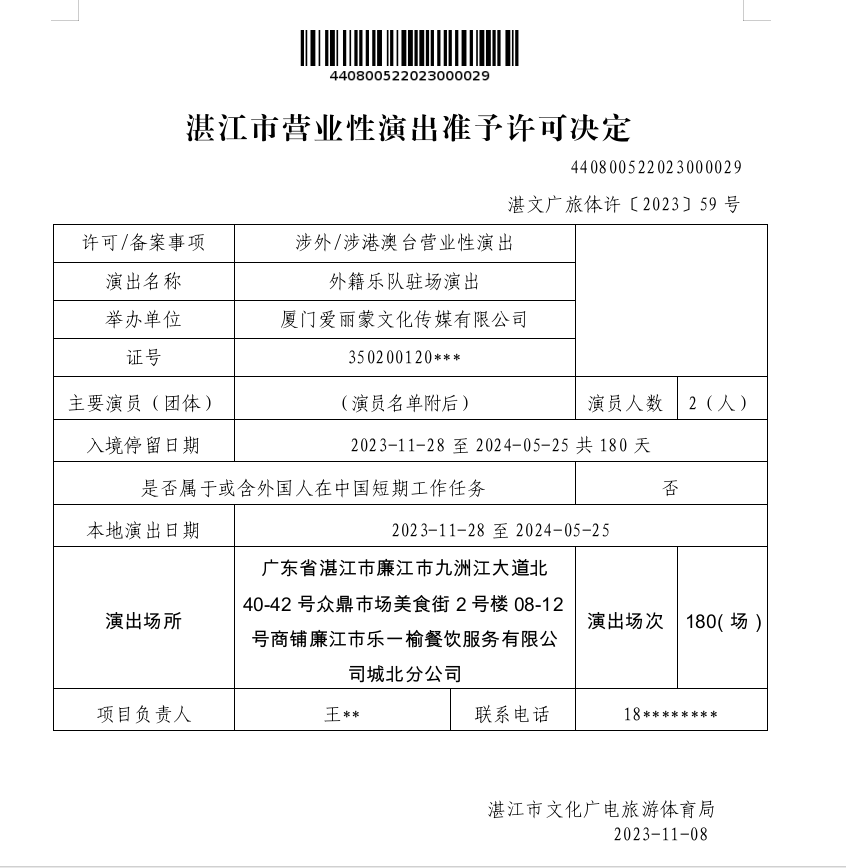 湛江市營業(yè)性演出準予許可決定-440800522023000029