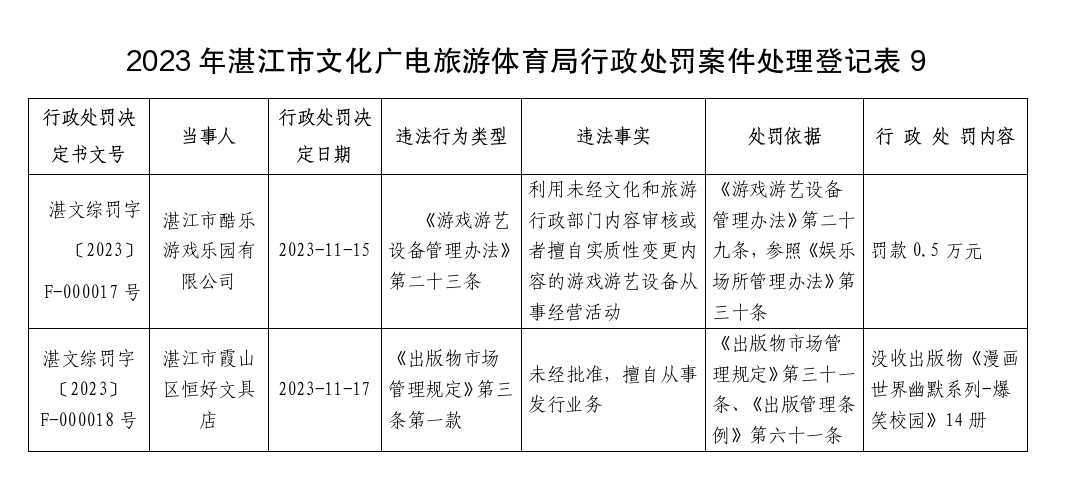 2023年湛江市文化廣電旅游體育局行政處罰案件處理登記表9