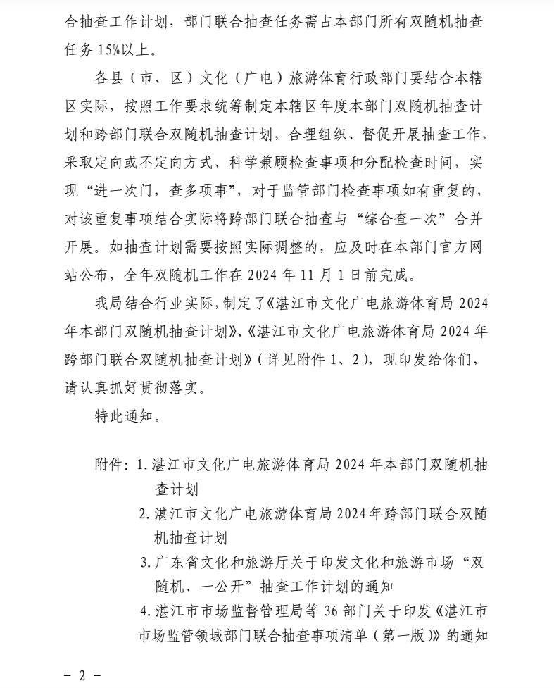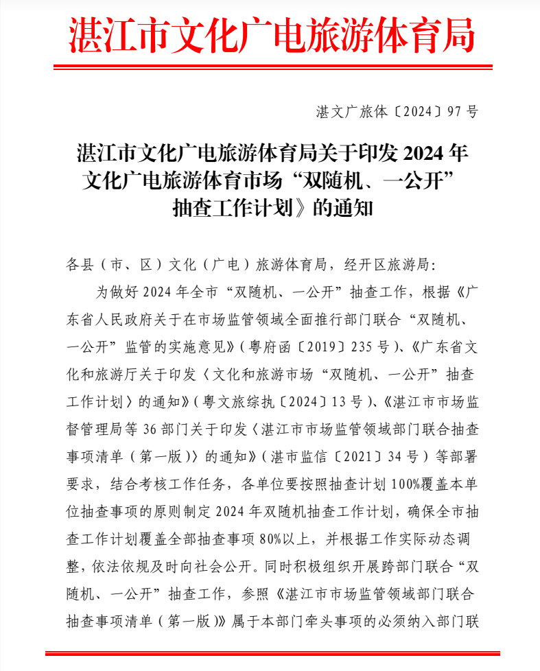 湛江市文化廣電旅游體育局關于印發(fā)2024年文化廣電旅游體育市場“雙隨機、一公開”抽查工作計劃》的通知