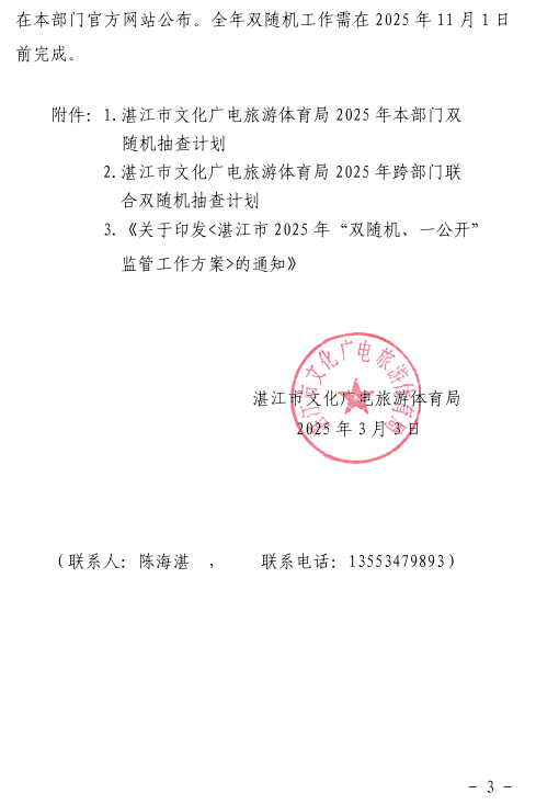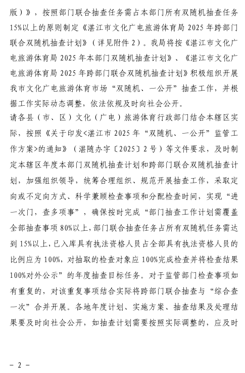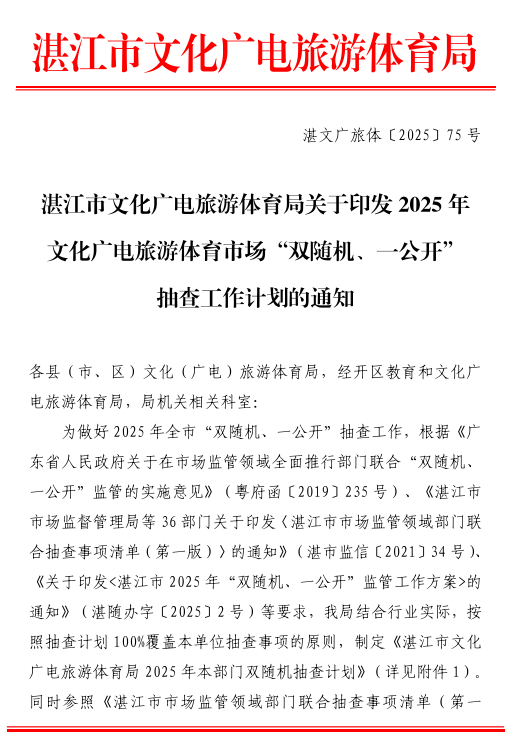 湛江市文化廣電旅游體育局關(guān)于印發(fā)2025年文化廣電旅游體育市場“雙隨機(jī)、一公開”抽查工作計(jì)劃的通知