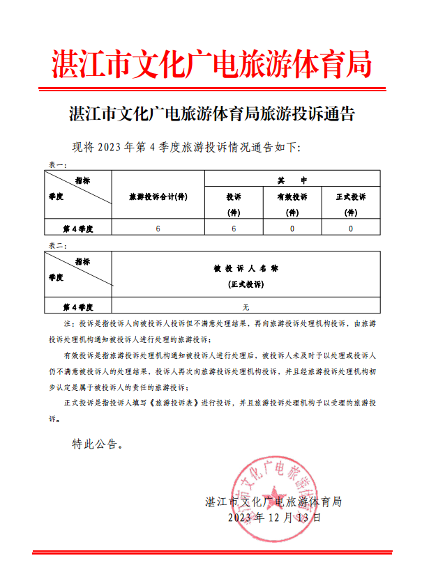 湛江市文化廣電旅游體育局旅游投訴通告