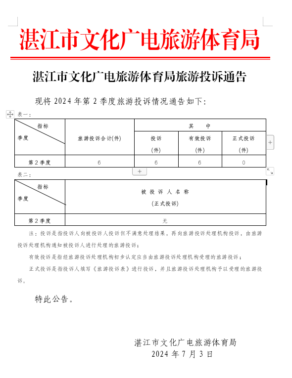 湛江市文化廣電旅游體育局2024年第二季度旅游投訴通告