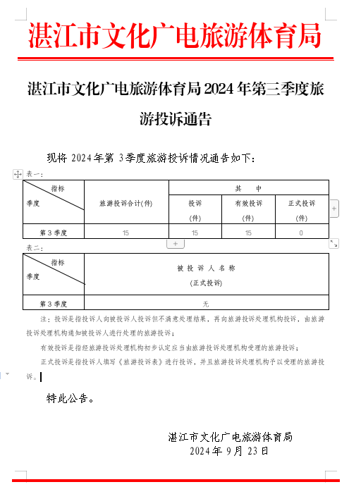 湛江市文化廣電旅游體育局2024年第三季度旅游投訴通告