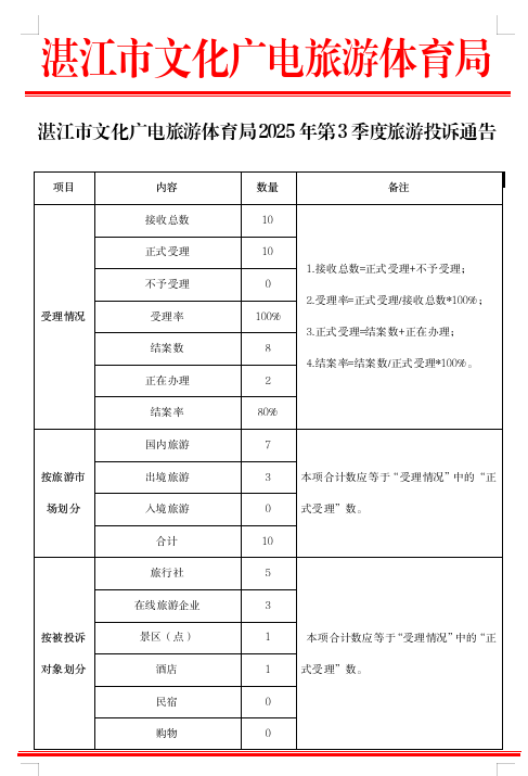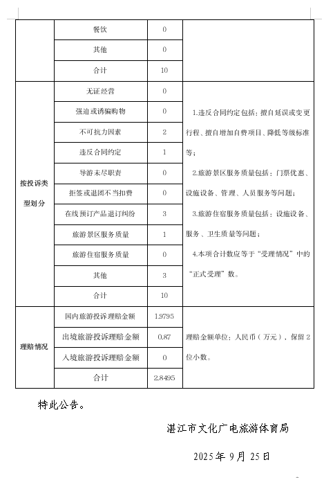湛江市文化廣電旅游體育局2025年第3季度旅游投訴通告