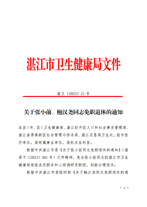 關(guān)于張小前、鮑漢堯同志免職退休的通知