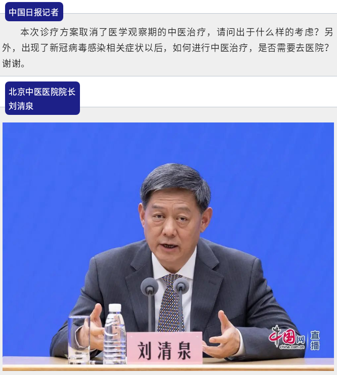 謝謝您的提問。疫情防控進(jìn)入新階段以來,特別是我們對新冠病毒感染實(shí)施“乙類乙管”以后,我們的工作重心從防控感染轉(zhuǎn)到了醫(yī)療救治。這次診療方案的修訂,中醫(yī)治療部分也是按照這個(gè)要求在進(jìn)行的。