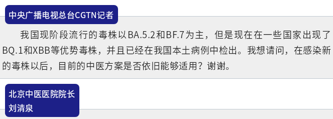 謝謝。目前,這對我們來講還是難以準(zhǔn)確判斷的問題,因?yàn)橹嗅t(yī)診斷疾病有中醫(yī)的基本思路,“審證求因、審因論治、三因制宜”,我們目前只是從文獻(xiàn)報(bào)道上獲得信息,關(guān)于BQ.1還有XBB的臨床表現(xiàn),目前我們看到的和國內(nèi)流行株之間似乎沒有明顯差異,仍然是上呼吸道感染為主,我們并沒有看到實(shí)際的臨床病例。這兩個(gè)變異株和目前國內(nèi)流行的變異株,從中醫(yī)來看,本質(zhì)上沒有大的差別,中醫(yī)核心病機(jī)是一致的,治療方案仍然可用。但從中醫(yī)病機(jī)變化來看,從原始株到變異株,主要以呼吸道為主,部分出現(xiàn)消化道癥狀,比如惡心、嘔吐、腹瀉,還有胃脹滿,不想吃飯等情況,這些情況也在十版方案的診療范圍之內(nèi)。謝謝。