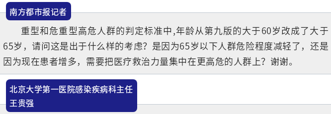 關(guān)于這次微調(diào),在臨床實(shí)踐中,我們確實(shí)發(fā)現(xiàn)65歲以上的患有基礎(chǔ)病、尤其沒有打疫苗的人群重癥化和危重癥比例更高,目前臨床上也發(fā)現(xiàn)了這樣的現(xiàn)象,所以這次診療方案進(jìn)行了微調(diào),但不管是60歲還是65歲,我們都要強(qiáng)調(diào)伴有基礎(chǔ)病的、沒有打疫苗的更需要關(guān)注。我們希望在臨床實(shí)踐中將這些高風(fēng)險(xiǎn)人群納入管理,早期干預(yù)和觀察,發(fā)現(xiàn)問題及時(shí)轉(zhuǎn)送上級醫(yī)院進(jìn)行進(jìn)一步救治,最大限度降低重癥和死亡的風(fēng)險(xiǎn)。