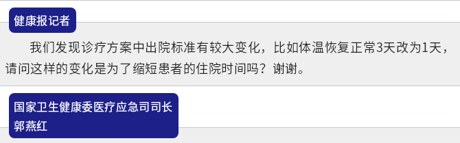 謝謝記者的提問。第十版診療方案對患者出院標(biāo)準(zhǔn)作出了比較大的調(diào)整,主要是基于現(xiàn)在防控策略的調(diào)整和臨床治療相關(guān)要求所進(jìn)行的調(diào)整。相關(guān)內(nèi)容是結(jié)合大量臨床實(shí)踐和對疾病的發(fā)生、發(fā)展和轉(zhuǎn)歸的一些規(guī)律性認(rèn)識而作出的完善。
