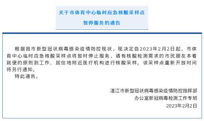 關(guān)于市體育中心臨時(shí)應(yīng)急核酸采樣點(diǎn)暫停服務(wù)的通告
