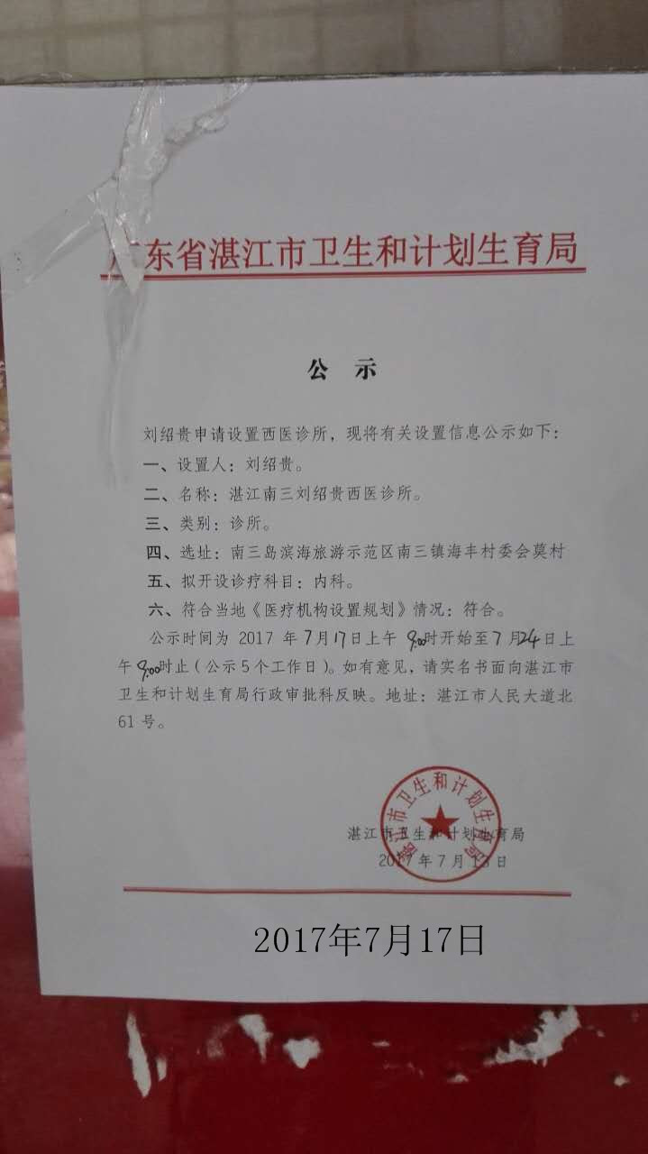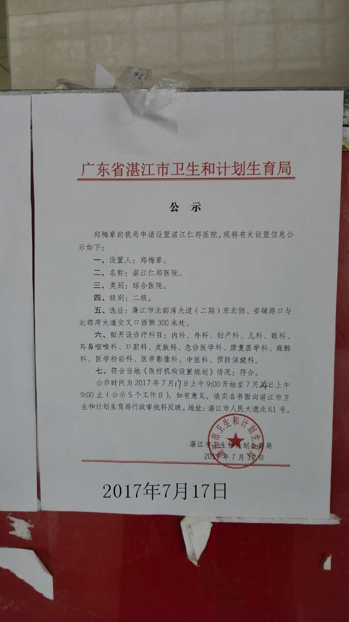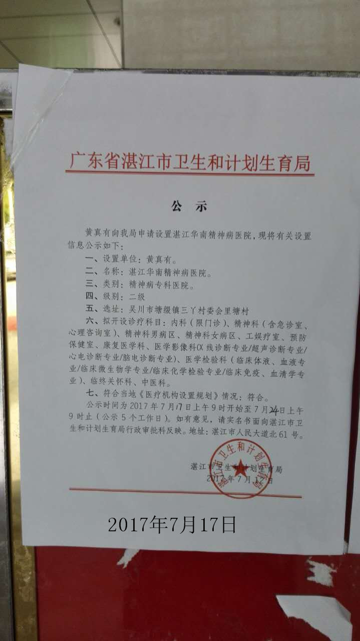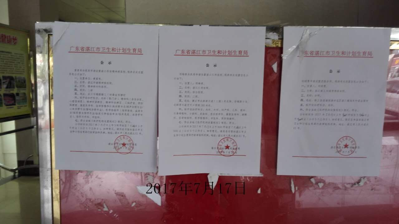 湛江市衛(wèi)生和計劃生育局關(guān)于《湛江華南精神病醫(yī)院》《湛江仁邦醫(yī)院》《湛江南三劉紹貴西醫(yī)診所》的公示
