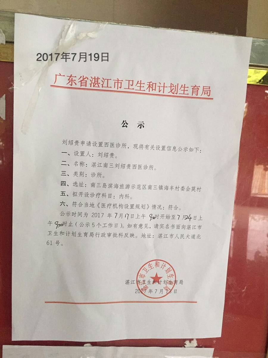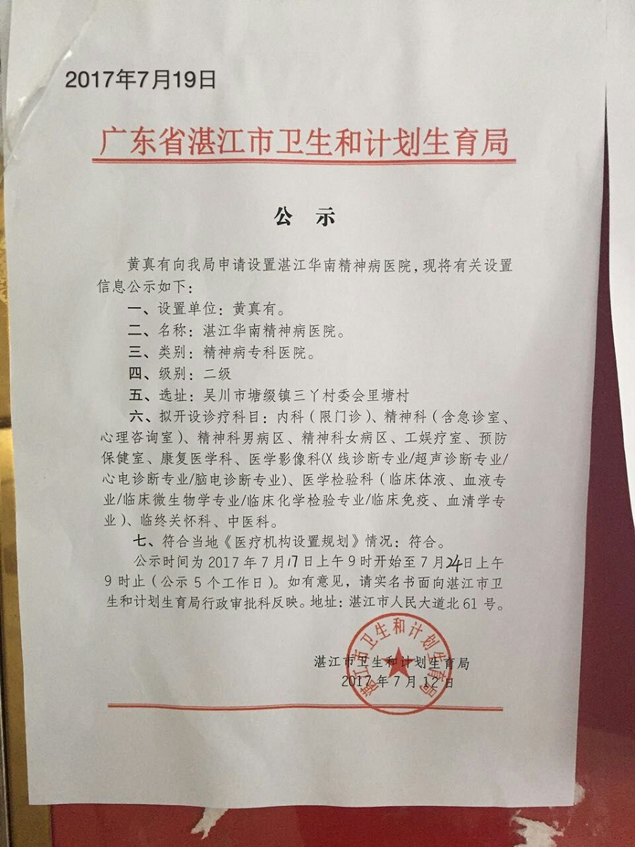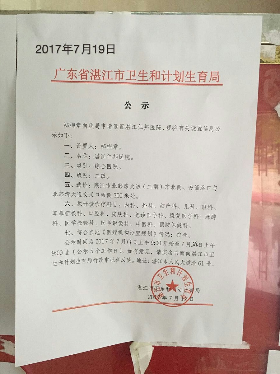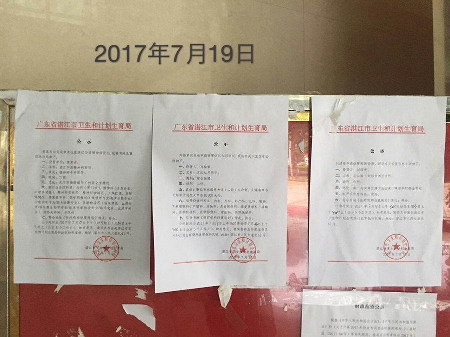 湛江市衛(wèi)生和計劃生育局關于《湛江華南精神病醫(yī)院》《湛江仁邦醫(yī)院》《湛江南三劉紹貴西醫(yī)診所》的公示(19日)