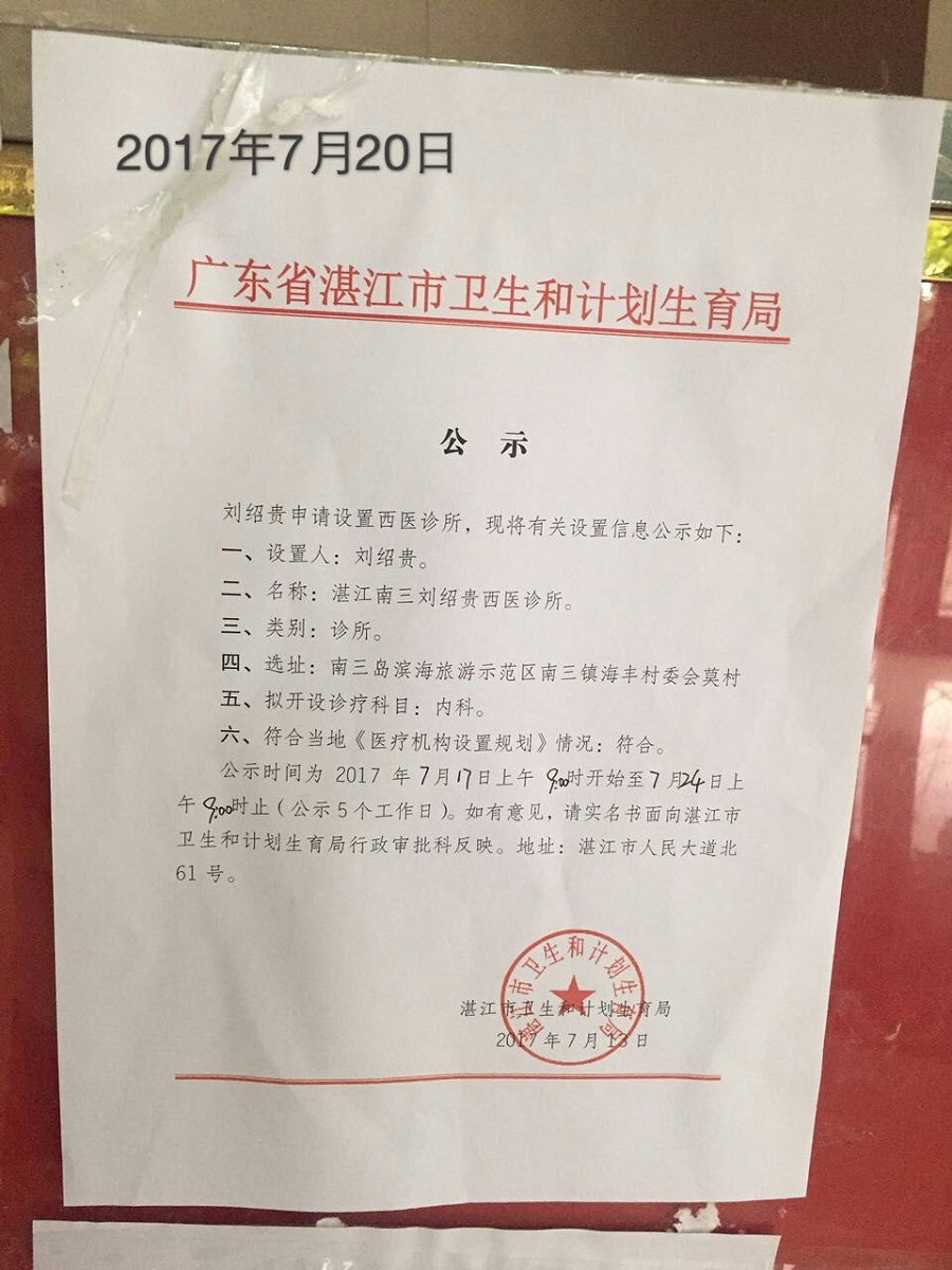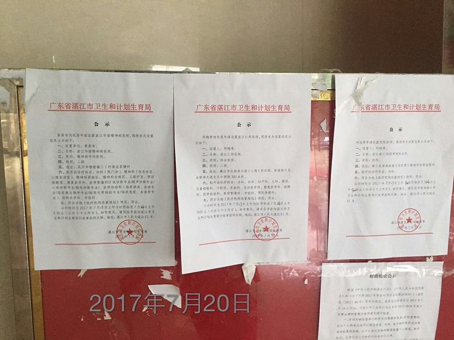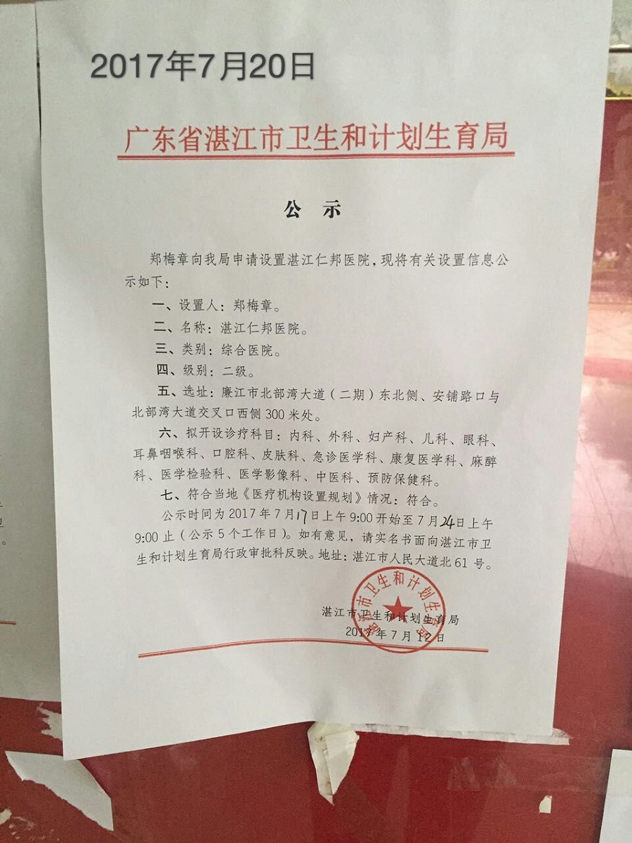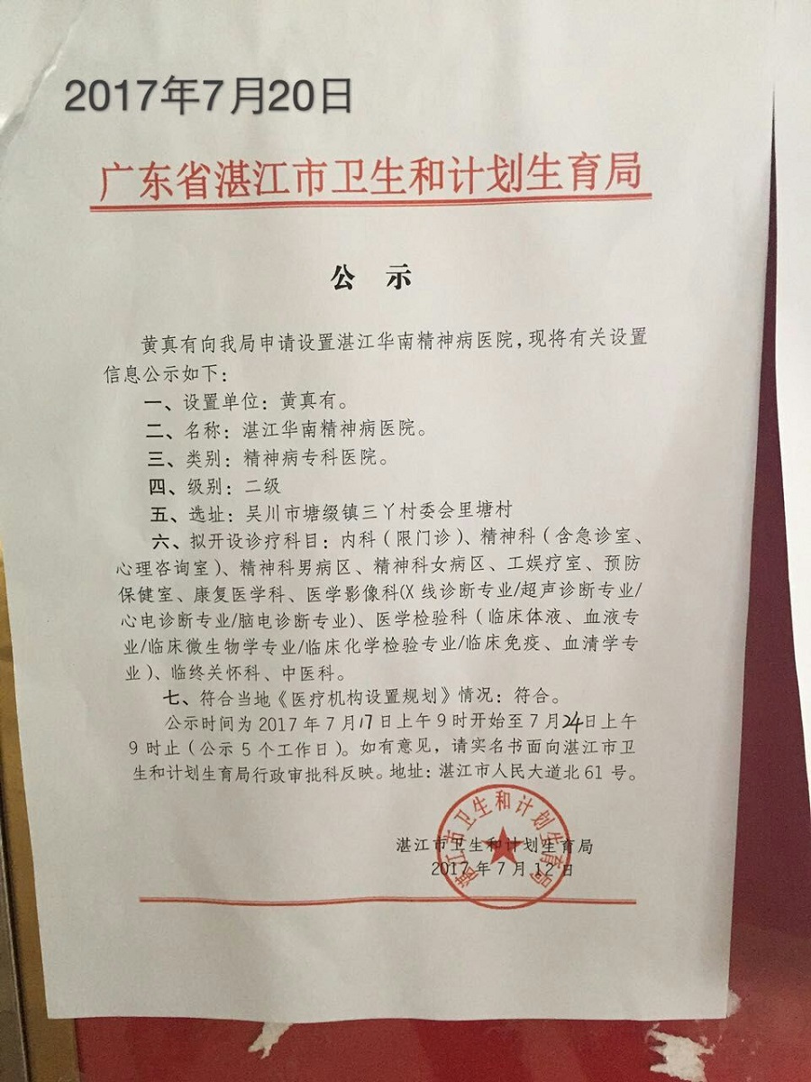 湛江市衛(wèi)生和計劃生育局關(guān)于《湛江華南精神病醫(yī)院》《湛江仁邦醫(yī)院》《湛江南三劉紹貴西醫(yī)診所》的公示(20日)
