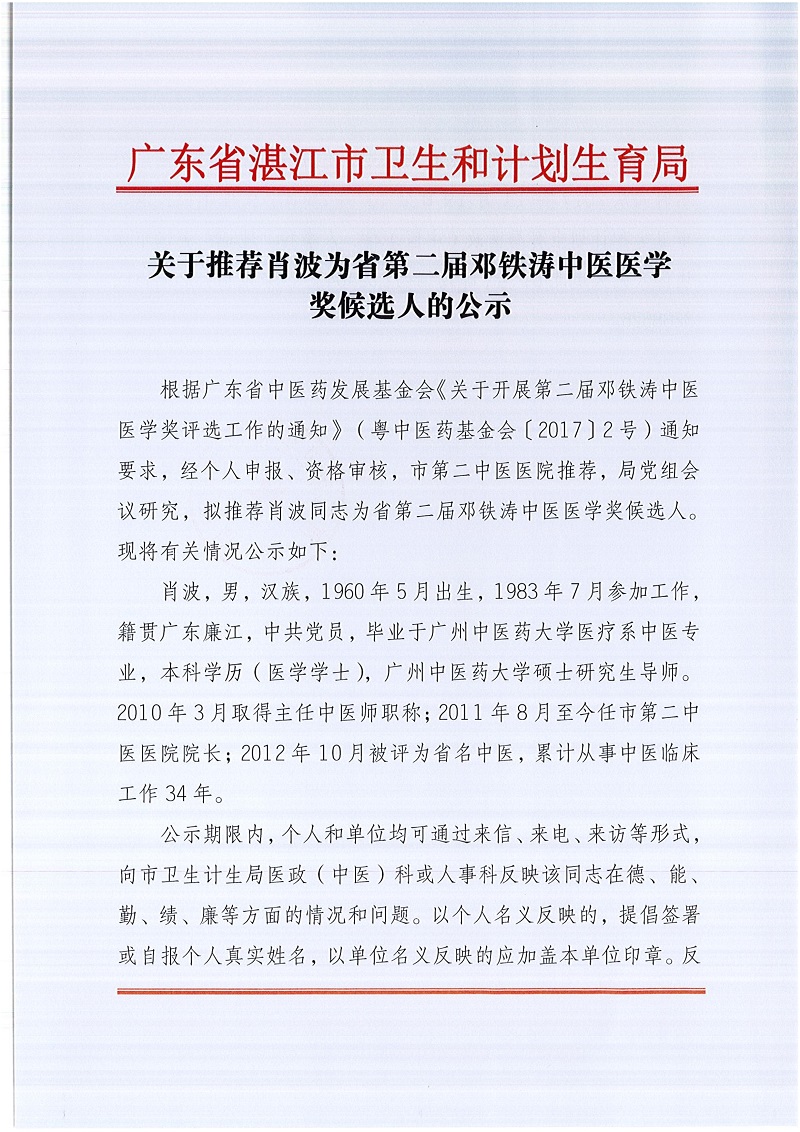 關(guān)于推薦肖波為省第二屆鄧鐵濤中醫(yī)醫(yī)學(xué)獎候選人的公示