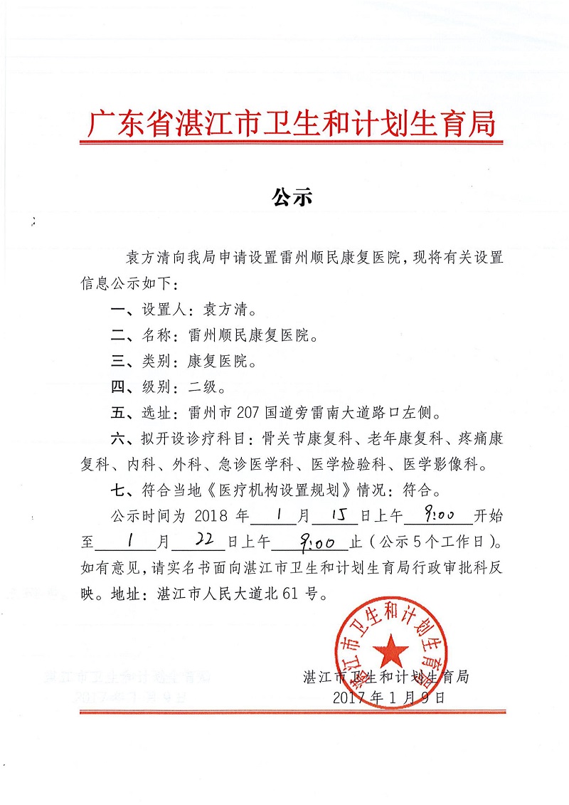 關(guān)于設(shè)置“雷州順民康復醫(yī)院”的公示