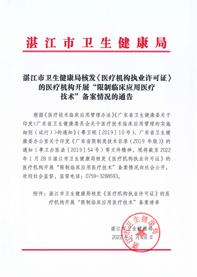 湛江市衛(wèi)生健康局核發(fā)《醫(yī)療機(jī)構(gòu)許可證》開(kāi)展“限制臨床應(yīng)用醫(yī)療技術(shù)”備案情況的通告