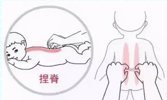 位置:脊柱正中線的兩側(cè)。操作:操作者用雙手的中指、無名指和小指握成空拳狀,食指半屈,拇指伸直并對準食指的前半部分。操作者從長強穴開始,操作用雙手食指與拇指合作,在食指向前輕推患兒皮膚的基礎(chǔ)上一起將長強穴的皮膚捏拿起來,沿督脈兩側(cè),自下而上,左右兩手交替合作,按照推、捏、捻、放、提的前后順序,自長強穴向前捏拿至脊背上端的大椎穴捏一遍。如此循環(huán),根據(jù)病情及體質(zhì)可捏拿4~6遍。從第2遍開始的任何一遍中,操作者可根據(jù)不同臟腑出現(xiàn)的癥狀,采用“重提”的手法,有針對性的刺激背部的臟腑俞穴,以便加強療效。在第5遍捏拿兒童脊背時,在兒童督脈兩旁的臟腑俞穴處,用雙手的拇指與食指合作分別將臟腑俞穴的皮膚,用較重的力量在捏拿的基礎(chǔ)上,提拉一下。捏拿第6遍結(jié)束后,用雙手拇指指腹在兒童腰部的腎俞穴處,在原處揉動的動作中,用拇指適當?shù)叵蛳率┮砸欢ǖ膲毫?,揉按結(jié)合(建議在醫(yī)生指導下操作)。功效:具有消食積、健脾胃、通經(jīng)絡(luò)的作用。