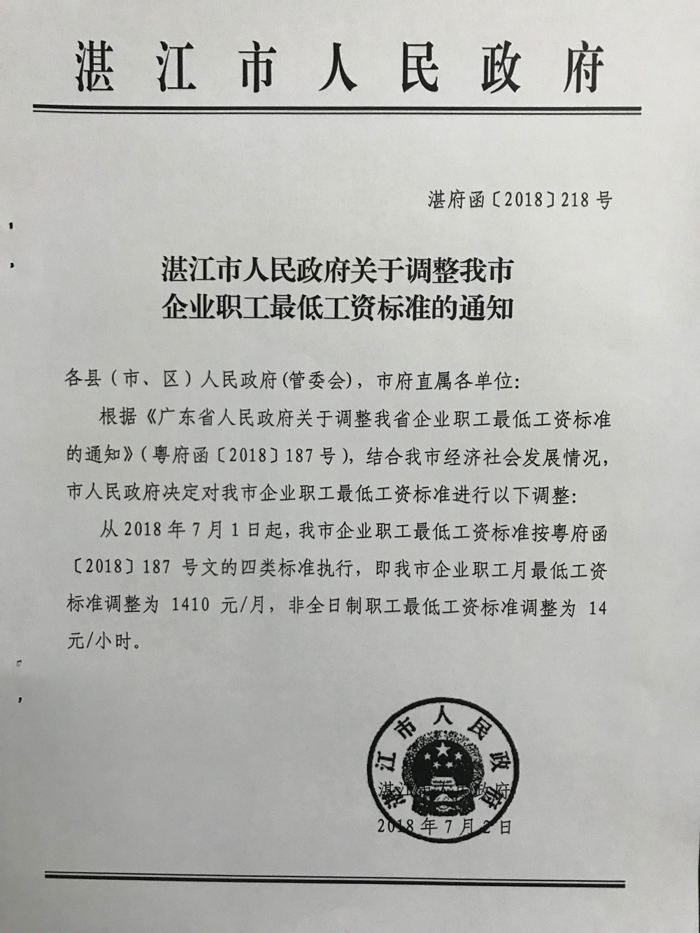 ??????? 附件:湛江市人民政府關(guān)于調(diào)整我市企業(yè)職工最低工資標(biāo)準(zhǔn)的通知(湛府函〔2018〕218號(hào))