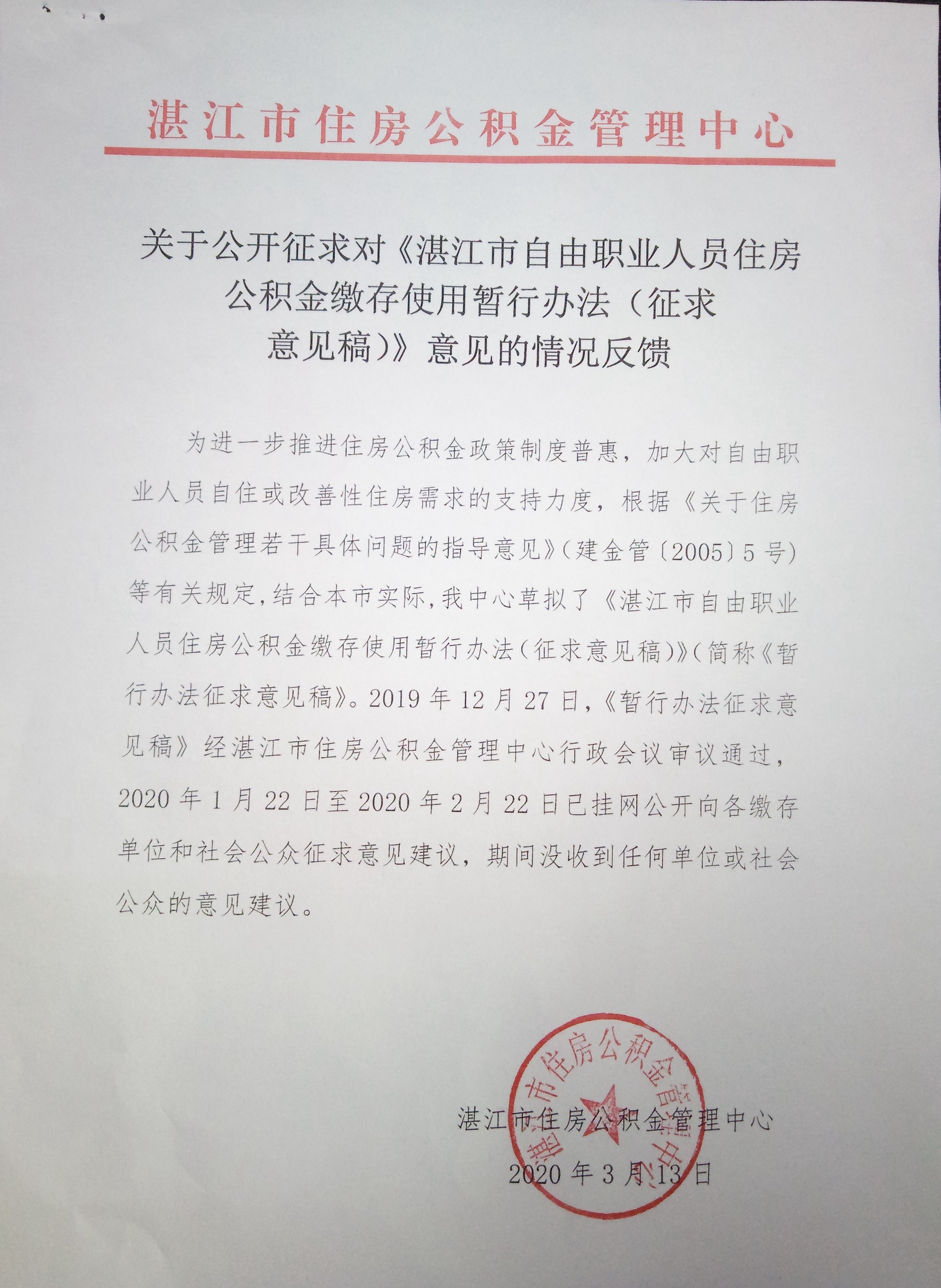 關(guān)于公開征求對《湛江市自由職業(yè)人員住房公積金繳存使用暫行辦法(征求意見稿)》意見的通知