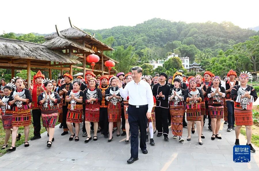 習(xí)近平沿長(zhǎng)廊察看黎族特色農(nóng)產(chǎn)品和黎錦、藤編等非物質(zhì)文化遺產(chǎn)展示。廣場(chǎng)上,歌聲悠揚(yáng)、鼓樂(lè)齊奏,村民們跳起竹竿舞迎接遠(yuǎn)方的客人。習(xí)近平親切地對(duì)大家說(shuō),很高興來(lái)看望黎族鄉(xiāng)親們,看到你們過(guò)上幸福生活,我感到很欣慰。我們?nèi)娼ǔ尚】瞪鐣?huì)以后,還要繼續(xù)奔向全體人民共同富裕,建設(shè)社會(huì)主義現(xiàn)代化國(guó)家。鄉(xiāng)村振興要在產(chǎn)業(yè)生態(tài)化和生態(tài)產(chǎn)業(yè)化上下功夫,繼續(xù)做強(qiáng)做大有機(jī)農(nóng)產(chǎn)品生產(chǎn)、鄉(xiāng)村旅游、休閑農(nóng)業(yè)等產(chǎn)業(yè),搞好非物質(zhì)文化遺產(chǎn)傳承,推動(dòng)鞏固拓展脫貧攻堅(jiān)成果同鄉(xiāng)村全面振興有效銜接。各級(jí)領(lǐng)導(dǎo)干部要貫徹黨的群眾路線,牢記黨的根本宗旨,想群眾之所想,急群眾之所急,把所有精力都用在讓老百姓過(guò)好日子上。
