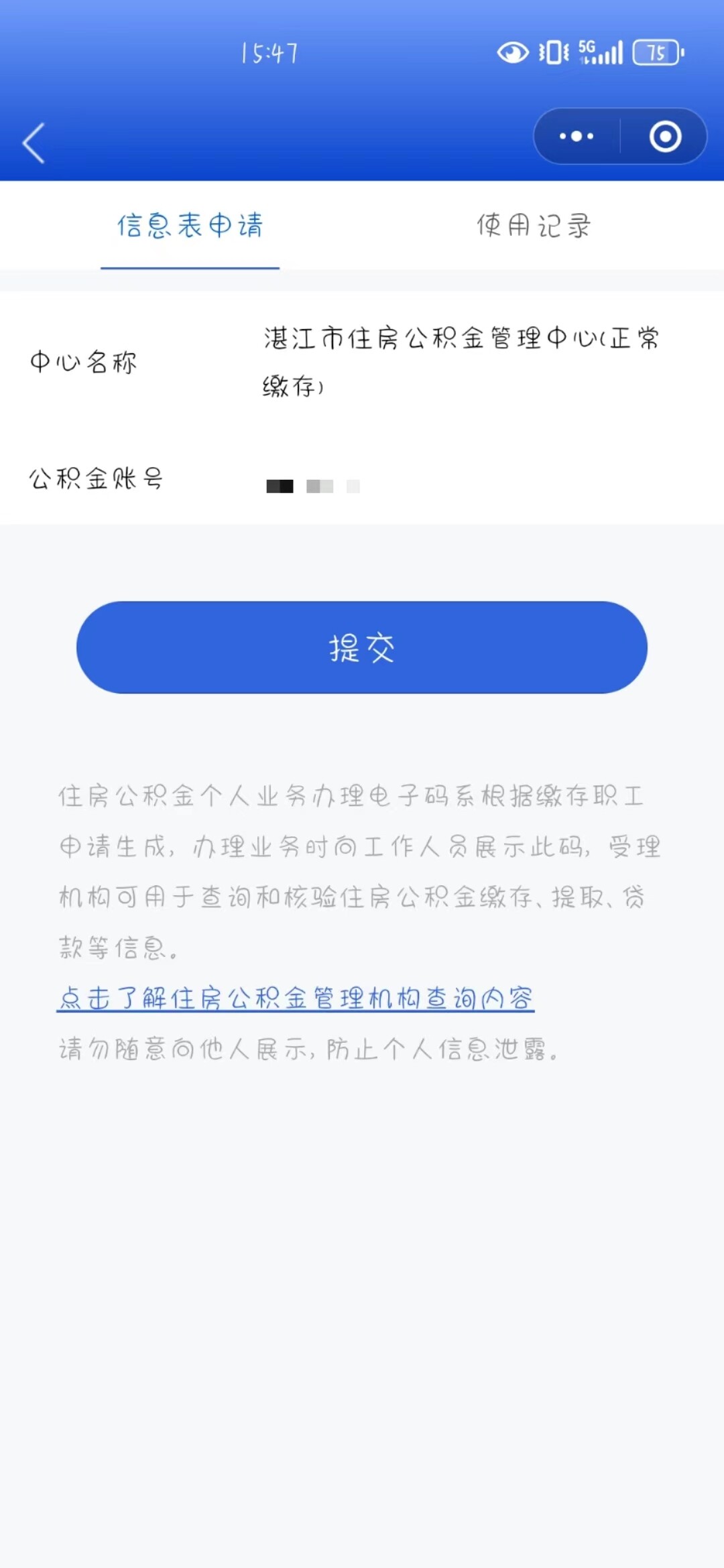 第二步:選擇“服務(wù)—業(yè)務(wù)辦理電子碼—信息表申請(qǐng)”,點(diǎn)擊“提交”按鈕,“電子碼”生成后,繳存職工可直接向住房公積金中心出具“電子碼”,中心工作人員可通過“電子碼”查詢到繳存職工的繳存、提取、貸款等信息。