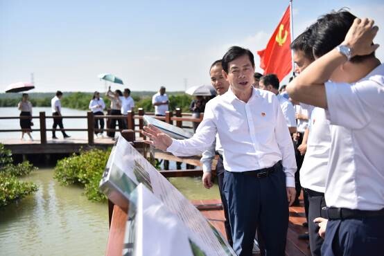 “國寶”紅樹林,要像愛護(hù)眼睛一樣守護(hù)好。第二站我們來到了金牛島紅樹林,白鷺振翅,候鳥歡聚,與紅樹林相映成趣。大家沿著水上木棧橋步行,近距離觀看紅樹林長勢(shì)和生長環(huán)境,了解紅樹林的種類、作用和湛江建設(shè)“紅樹林之城”的意義,重溫習(xí)近平總書記在湛江考察調(diào)研時(shí)的殷殷囑托,深刻體會(huì)習(xí)近平總書記的重要講話精神,“紅樹林是‘國寶’,要像愛護(hù)眼睛一樣守護(hù)好”,真切感受人與自然和諧相處的美好,感悟保護(hù)紅樹林的重要意義。