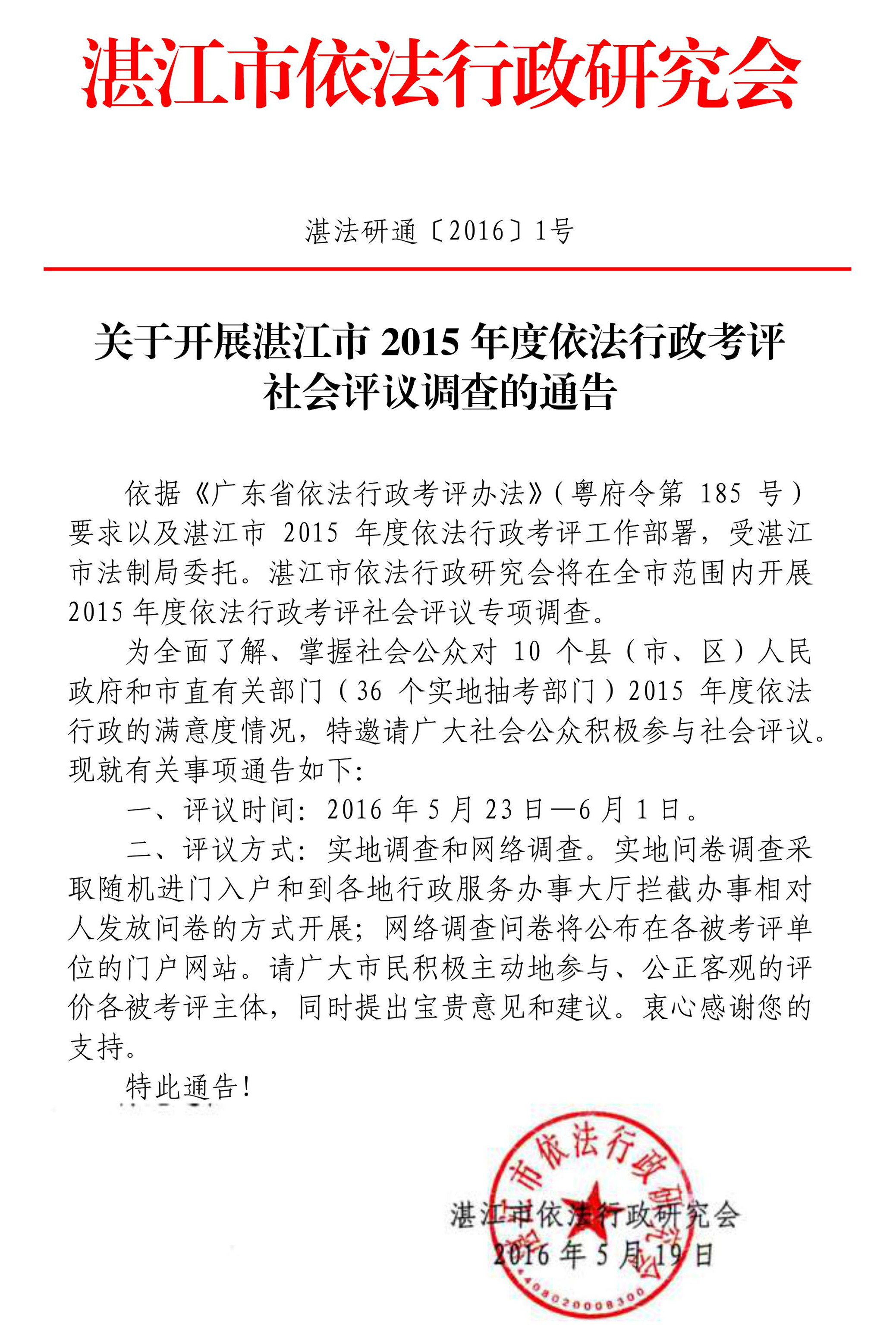 關(guān)于開展湛江市2015年度依法行政考評社會評議調(diào)查的通告