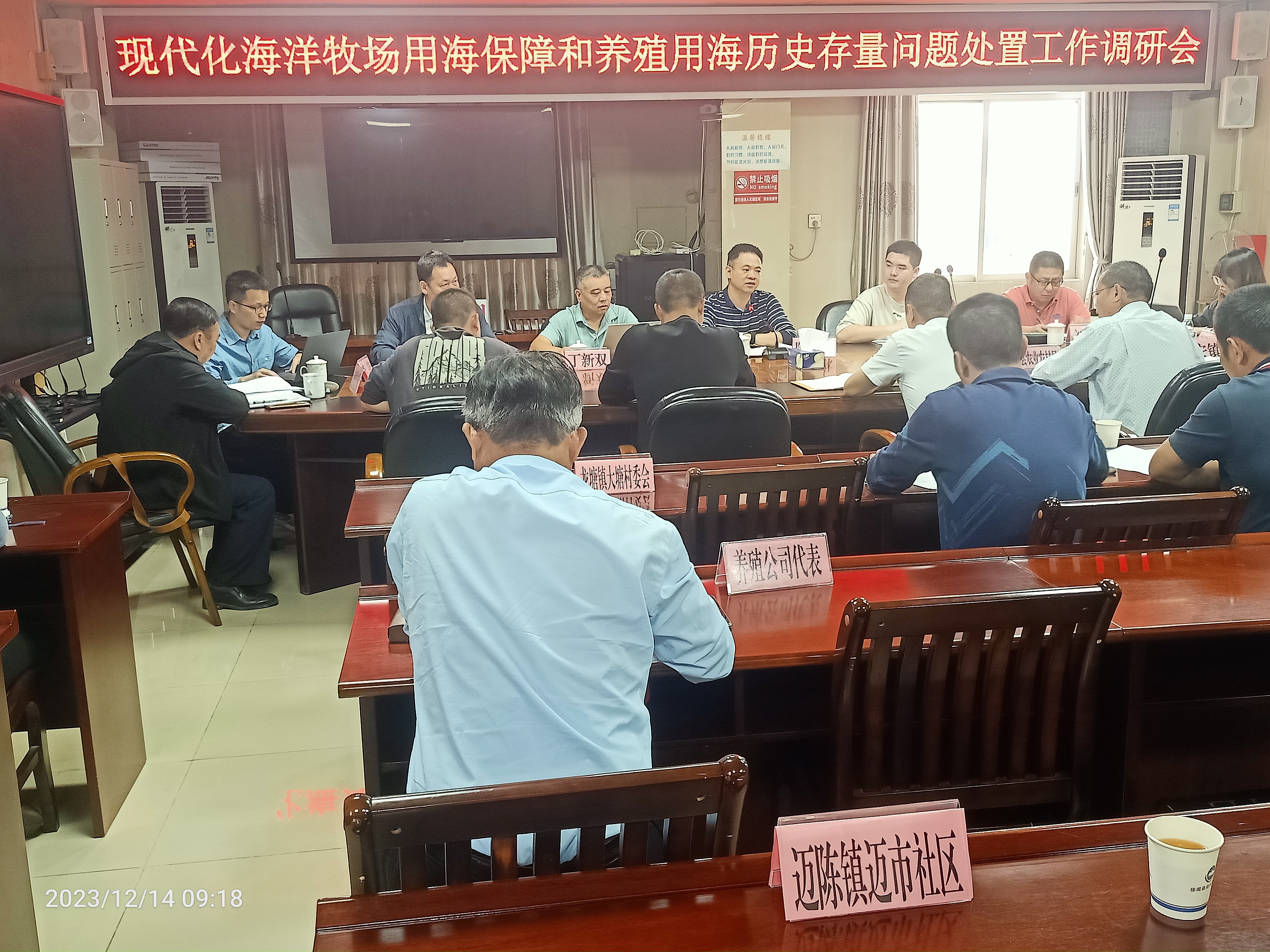 12月14日上午,省自然資源廳海域海島管理處副處長陳琳率調(diào)研組到徐聞以召開座談會(huì)的形式調(diào)研現(xiàn)代化海洋牧場用海保障和養(yǎng)殖用海歷史存量問題處置工作,聽取大家對(duì)現(xiàn)代化海洋牧場用海保障和養(yǎng)殖用海歷史存量問題處置工作提出的意見建議,為廣東下一步制定出臺(tái)“疏近用遠(yuǎn)、科學(xué)布局”用海政策提供決策參考。省自然資源廳、省土地調(diào)查規(guī)劃院、省海洋發(fā)展規(guī)劃研究中心、湛江市自然資源局、湛江市農(nóng)業(yè)農(nóng)村局、徐聞縣自然資源局、徐聞縣農(nóng)業(yè)農(nóng)村局有關(guān)人員及和安、龍?zhí)?、邁陳、西連鎮(zhèn)分管規(guī)劃工作領(lǐng)導(dǎo),養(yǎng)殖公司及養(yǎng)殖戶代參加座談。