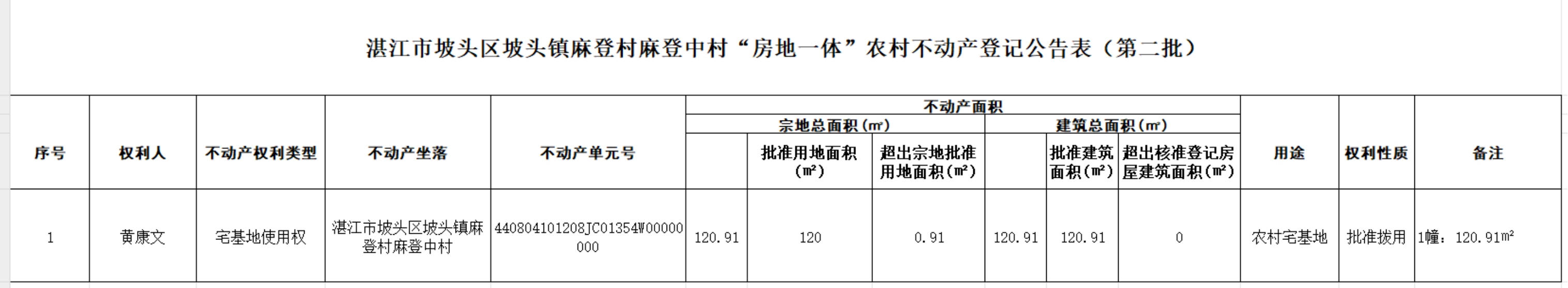 附表:坡頭區(qū)坡頭鎮(zhèn)麻登村麻登中村“房地一體”農(nóng)村不動(dòng)產(chǎn)登記公告表(第二批)