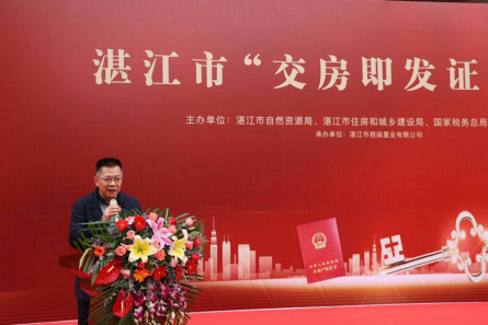 2021年1月25日上午,湛江市新建商品房“交房即交證”啟動(dòng)儀式在御景華府住宅小區(qū)舉行,湛江市自然資源局黨組書記、局長吳松江、湛江市稅務(wù)局黨委副書記(主持全面工作)、廣東省稅務(wù)局第四稅務(wù)分局副局長(主持全面工作) 蒙全忠、湛江市住房和城鄉(xiāng)建設(shè)局副局長莫大成等單位相關(guān)領(lǐng)導(dǎo)參加儀式。