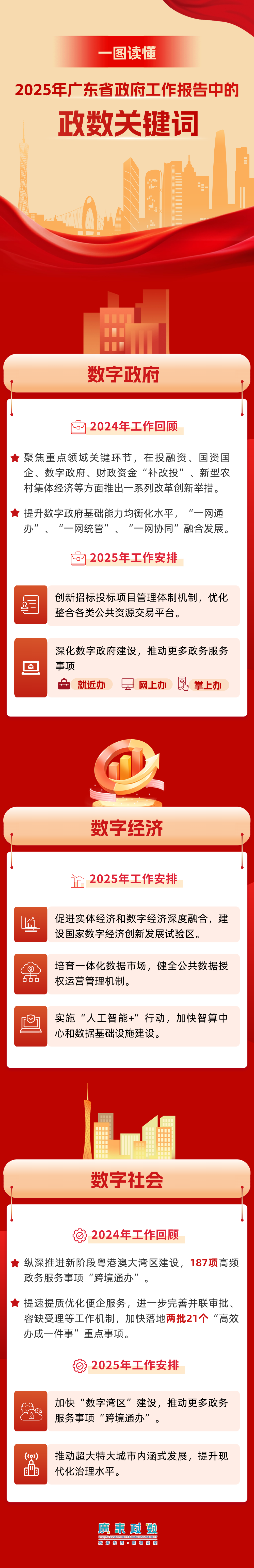 在今年廣東省《政府工作報(bào)告》中,數(shù)字化仍然是工作熱點(diǎn)。既有對數(shù)字政府系列改革創(chuàng)新舉措的肯定,也有對加快“數(shù)字灣區(qū)”建設(shè)、促進(jìn)實(shí)體經(jīng)濟(jì)和數(shù)字經(jīng)濟(jì)深度融合、深化數(shù)字政府建設(shè)等的期待和要求,為新一年工作指明了方向,畫出了施工圖。