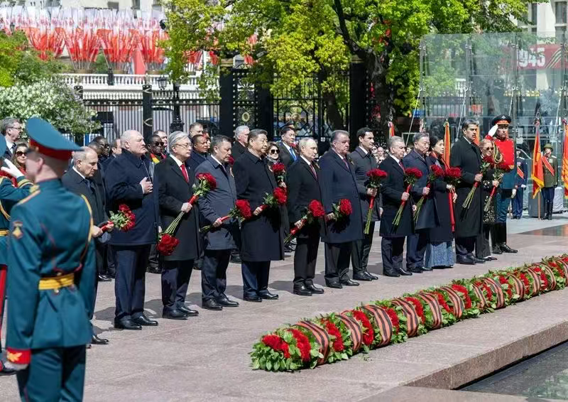 當(dāng)?shù)貢r(shí)間5月9日,俄羅斯舉行盛大慶典,紀(jì)念蘇聯(lián)偉大衛(wèi)國(guó)戰(zhàn)爭(zhēng)勝利80周年。國(guó)家主席習(xí)近平和來(lái)自世界20多個(gè)國(guó)家及國(guó)際組織領(lǐng)導(dǎo)人應(yīng)邀出席慶典。慶典結(jié)束后,習(xí)近平同其他國(guó)家領(lǐng)導(dǎo)人一起從紅場(chǎng)來(lái)到亞歷山大花園,向無(wú)名烈士墓獻(xiàn)花,并肅立默哀。新華社記者 翟健嵐 攝