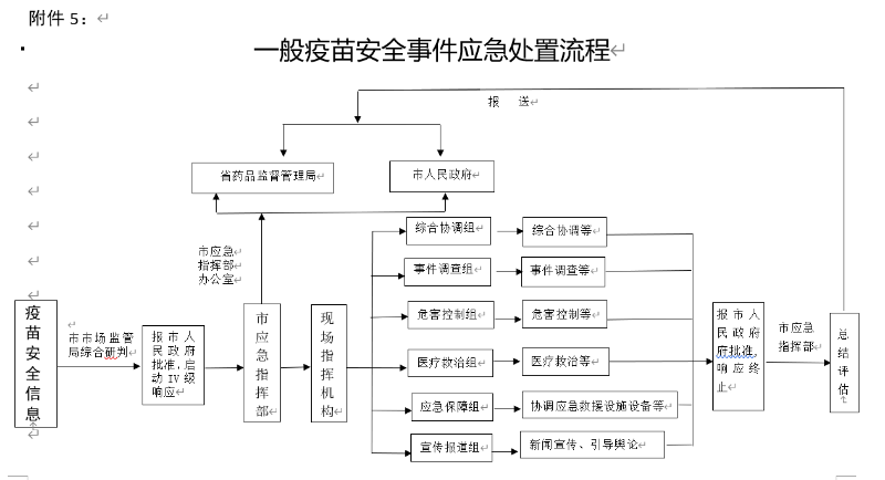 4.2.1 市應(yīng)急指揮部收到省藥品監(jiān)督管理局通知或通報后,第一時間通知本行政區(qū)域內(nèi)的各級市場監(jiān)管部門和衛(wèi)生健康部門、疾病預(yù)防控制機構(gòu)、相關(guān)疫苗配送企業(yè)、接種單位立即停止采購、配送和使用涉事疫苗;組織對涉事疫苗進行就地封存、核查疫苗采購和配送渠道、追蹤流向并進行匯總統(tǒng)計;對本行政區(qū)域內(nèi)相關(guān)疫苗不良事件進行統(tǒng)計。