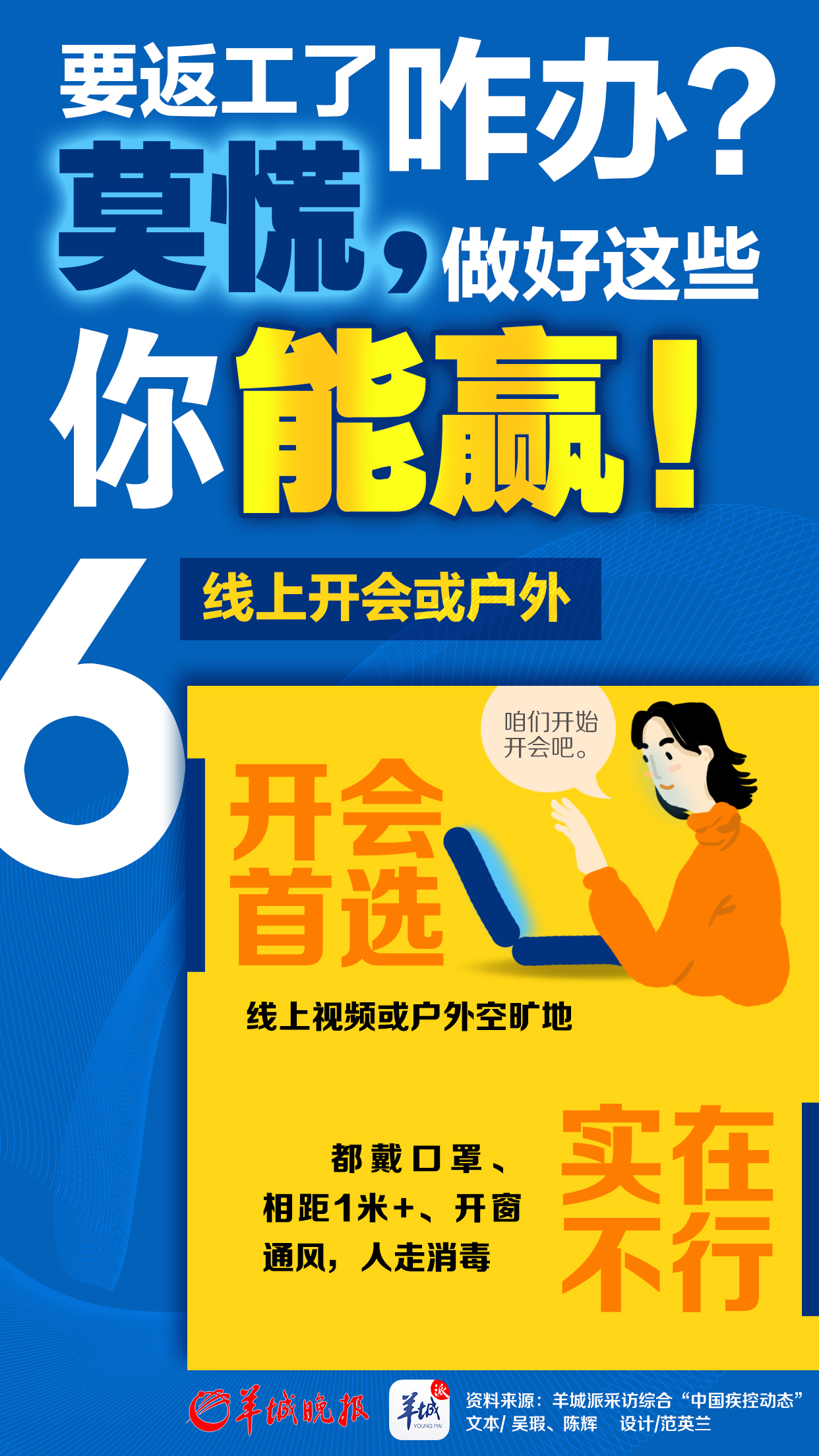 盡量選擇線上開(kāi)會(huì),或者在戶外比較空曠地地方開(kāi)會(huì)。如果一定要在室內(nèi)開(kāi)會(huì),建議佩戴口罩,進(jìn)入會(huì)議室前洗手消毒,開(kāi)會(huì)人員之間間隔1米以上。
