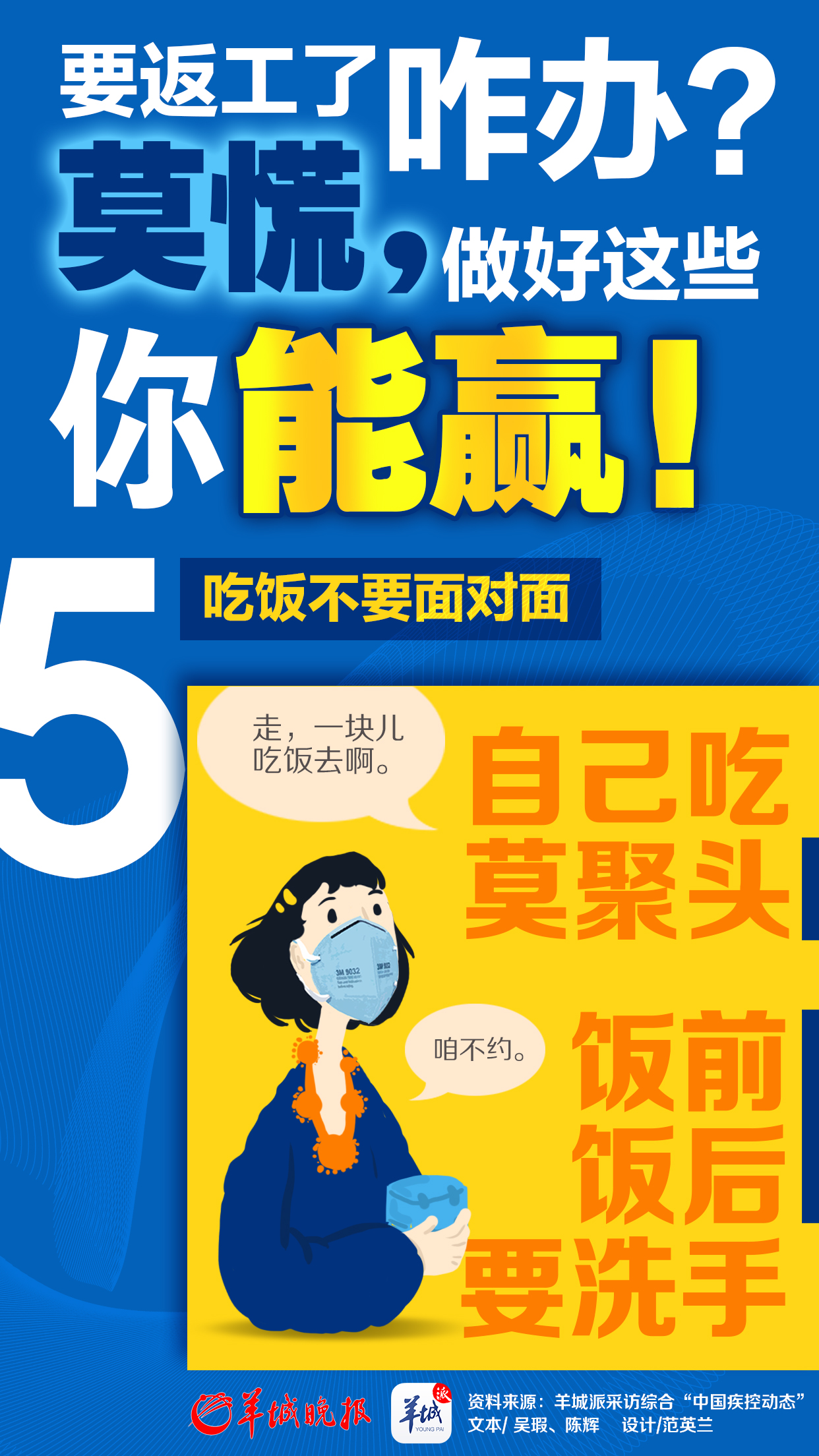 在吃飯的最后一刻摘下口罩,盡量避免幾個(gè)人坐在一起,特別是面對(duì)面地吃飯,有條件的單位,最好打包回去到人少的地方安安靜靜地吃飯。飯前飯后都要注意洗手。