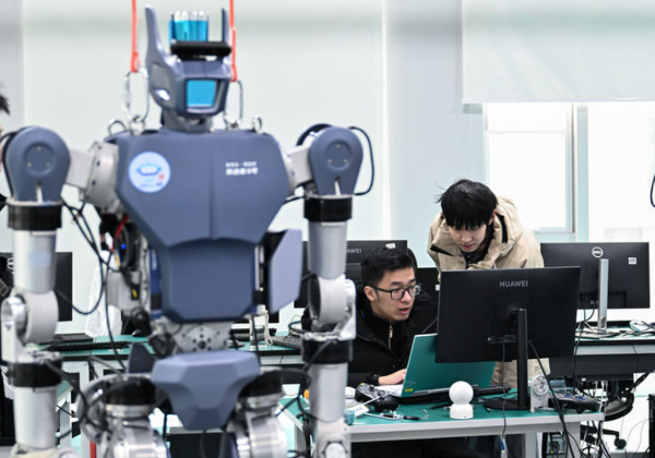 2025年2月24日,武漢格藍若智能技術(shù)股份有限公司的研發(fā)團隊成員在調(diào)試人形機器人。新華社記者 杜子璇 攝