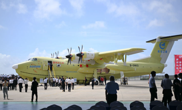 2025年6月11日在珠海中航通飛華南飛機工業(yè)有限公司拍攝的批量生產(chǎn)的首架AG600飛機。當日,大型水陸兩棲飛機AG600“鯤龍”獲頒中國民航局生產(chǎn)許可證,標志著AG600飛機正式邁入批量生產(chǎn)階段。新華社記者 鄧華 攝